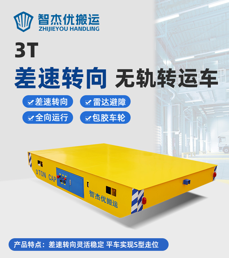 智杰優(yōu)搬運研發(fā)制造的無軌電動搬運車,長3米寬2米高0.6米額定載重3噸,主要用于廠區(qū)跨車間的設備轉(zhuǎn)運作業(yè),蓄電池供電運行路線自由,電量顯示表實時顯示平車剩余電量信息,具有低電量提醒,智能充電機充滿自動斷電防止過充損壞電池,輪系采用驅(qū)動輪+萬向輪,運行方向自由,采用差速轉(zhuǎn)向可實現(xiàn)S型走位,無線遙控操作,前進后退左右轉(zhuǎn)彎原地旋轉(zhuǎn)等運動控制,具有一定的上坡能力,適用于室內(nèi)室外的設備轉(zhuǎn)運過跨,提高生產(chǎn)效率。